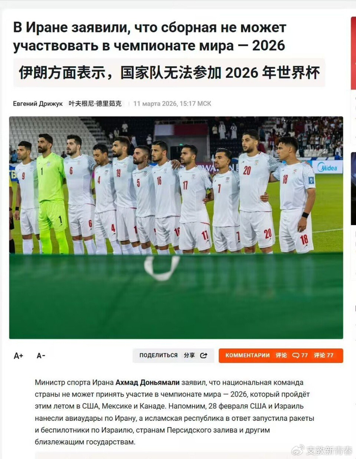 伊朗正式宣布退出2026年美加墨世界杯!3月11日,伊朗体育部部长杜尼亚马利在接受媒体采访时表示:介于局势问题,伊朗男足将退出2026年美加墨世界杯。看到这些新闻,那些夸夸其谈体育无国界的人,那些标榜公平正义的赛事,包括奥运会,什么赛事都是扯淡。据悉,伊朗男足原本与比利时、埃及、新西兰同组,三场世界杯小组赛均在美国本土进行。那么,伊朗男足就无法避免政治冲突与...