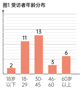 受访者中男性18人(51.4%),比女性略多(17人/48.6%)。人数最多的区间为18-29岁(11人/31.4%)和30-45岁(13人/37.1%),总计占比近七成(68.5%),覆盖了商业统计中常提到的“年轻群体”(多为19-35岁)。(图1)